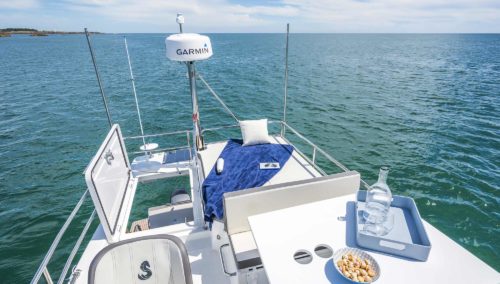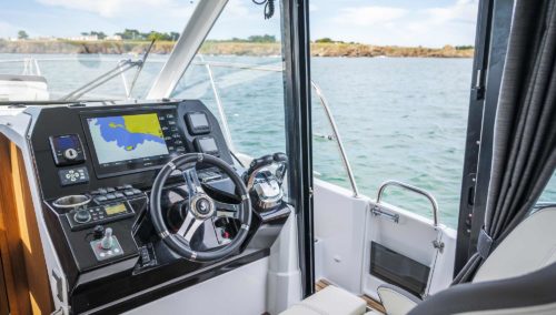 The BENETEAU Antares 11 is the largest cruiser in the Antares fleet and focuses on the core values of comfort, space, and safety. Twin Mercury 300 V-8s pair perfectly with the hull, offering a smooth, dry and efficient ride. An optional joystick piloting allows the Antares 11 to be nimble even in the tightest of marinas. An aft sun bench, side swim platform creating a sea-view terrace, and forward sun pad provide the perfect spots to enjoy the days’ activities. Natural light fills the spacious wheelhouse from surrounding windows. A port side table with seating for up to four offers a great space to gather to relax. Below deck, a well-appointed double master cabin offers a central island bed with ample storage, and an ensuite bathroom. A full-beam aft cabin features a double bed and single berth, in addition to the easily convertible salon settee. The flybridge is fitted with a starboard helm station with optional electronics. Two benches on the port side, along with an aft sun pad, create an open-air salon. An optional refrigerator can be added, making the flybridge an extremely popular destination itself.