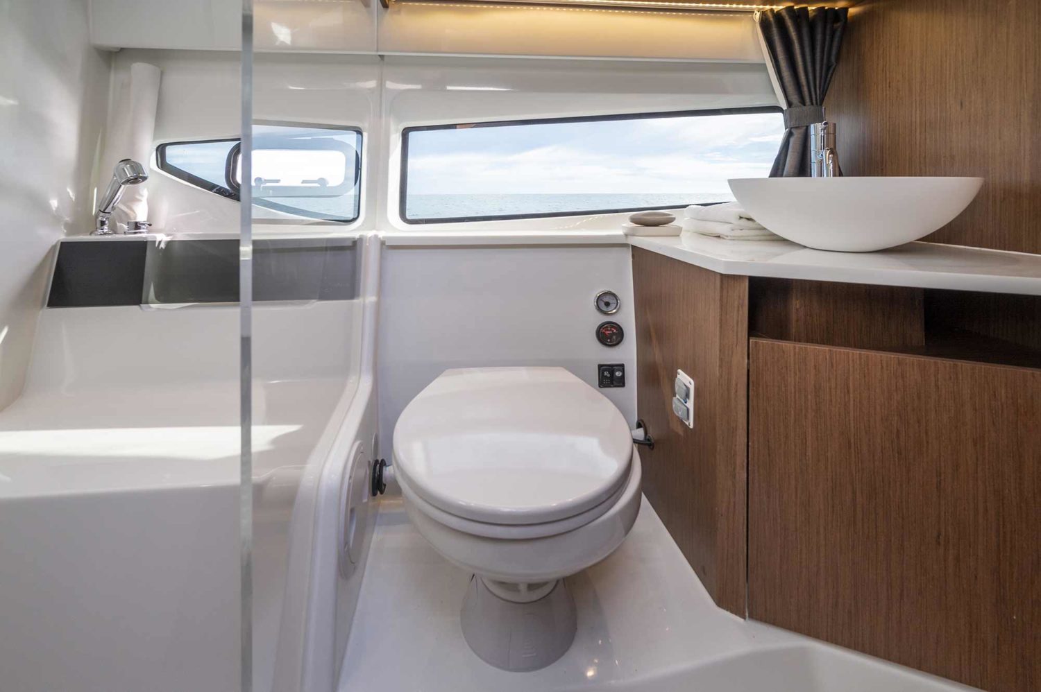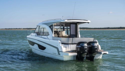The BENETEAU Antares 11 is the largest cruiser in the Antares fleet and focuses on the core values of comfort, space, and safety. Twin Mercury 300 V-8s pair perfectly with the hull, offering a smooth, dry and efficient ride. An optional joystick piloting allows the Antares 11 to be nimble even in the tightest of marinas. An aft sun bench, side swim platform creating a sea-view terrace, and forward sun pad provide the perfect spots to enjoy the days’ activities. Natural light fills the spacious wheelhouse from surrounding windows. A port side table with seating for up to four offers a great space to gather to relax. Below deck, a well-appointed double master cabin offers a central island bed with ample storage, and an ensuite bathroom. A full-beam aft cabin features a double bed and single berth, in addition to the easily convertible salon settee.