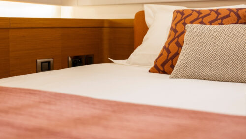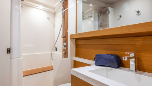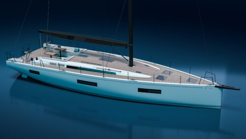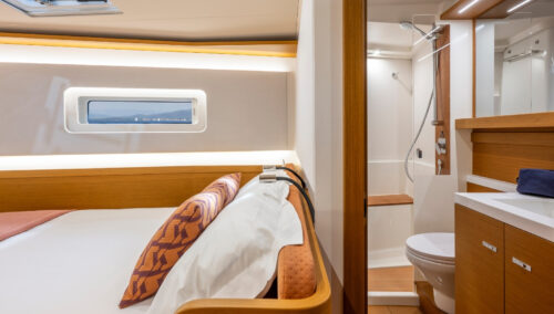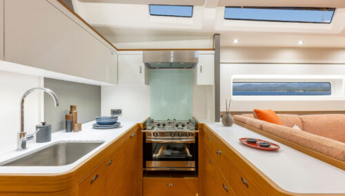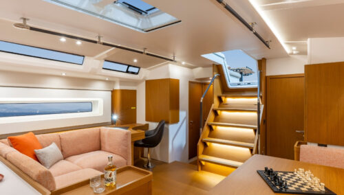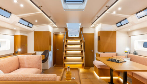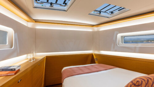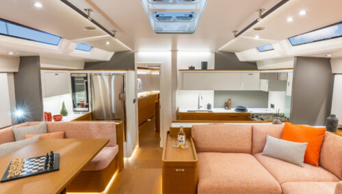 The interior of the FIRST 60 offers a spacious, refined layout, with every detail designed to enhance the pleasure of life at sea. Below deck, a cosy dining area faces the owner’s corner, complete with a generous navigation table and sofa. The full-beam galley, with its elongated worktop and integrated storage, ensures effortless efficiency under sail. A standout feature is the owner’s cabin, which boasts a large walk-around, forward-facing bed, abundant natural light, and calming views of the sea.
