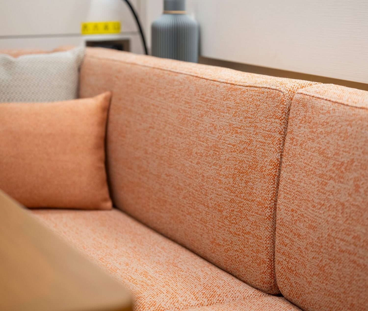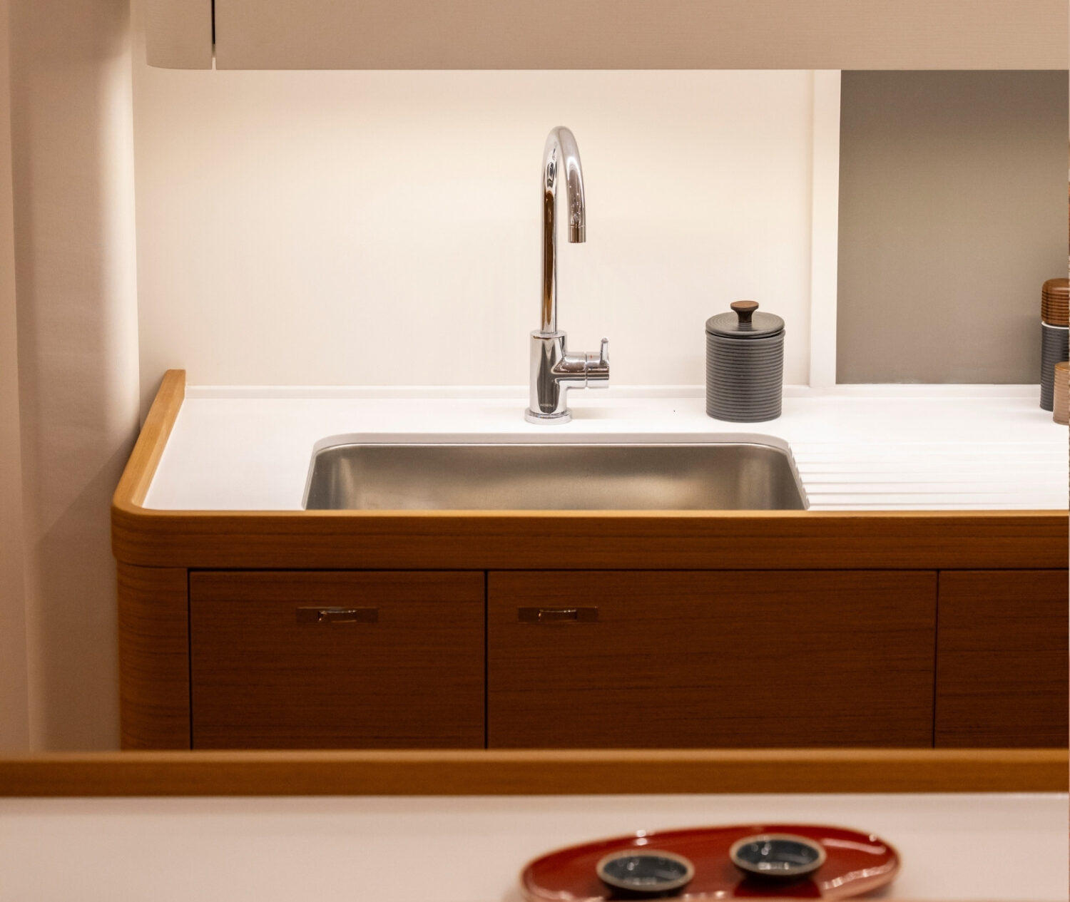 The interior of the FIRST 60 offers a spacious, refined layout, with every detail designed to enhance the pleasure of life at sea. Below deck, a cosy dining area faces the owner’s corner, complete with a generous navigation table and sofa. The full-beam galley, with its elongated worktop and integrated storage, ensures effortless efficiency under sail. A standout feature is the owner’s cabin, which boasts a large walk-around, forward-facing bed, abundant natural light, and calming views of the sea.