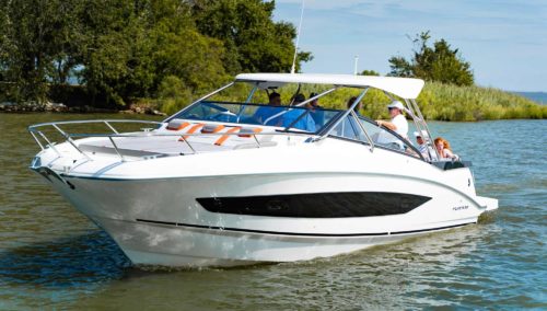 The BENETEAU Flyer 10 elevates the dayboat concept into a true live-aboard powerboat. A large swim platform runs flush into the cockpit leading into a full galley with optional gas or electric barbecue, and fridge. The U-shaped cockpit is a perfect place to gather around a large table, which converts into an additional sun pad area. Starboard side, the helm station features two pilot bolster seats, Garmin, and Fusion audio electronics. Open the port side windshield for easy access to the bow sun lounge. Below deck, two double berths divided among a salon cabin and a mid-cabin with a head and separate shower.