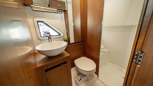 The exterior deck layout is fully optimized for comfort and entertainment onboard. Two bench seats face forward at the helm station, so four people can enjoy the thrills of navigation. The electric sunroof allows the whole area to be bathed in pleasant natural light. The natural light extends to a spacious cockpit lounge area which has room for up to seven passengers. Cleverly interchangeable, the aft bench seats fold back and serve as headrests for the extensive sunbathing area facing aft. Cooking meals is a joy in the outdoor galley, which is just forward of the aft swim platform.