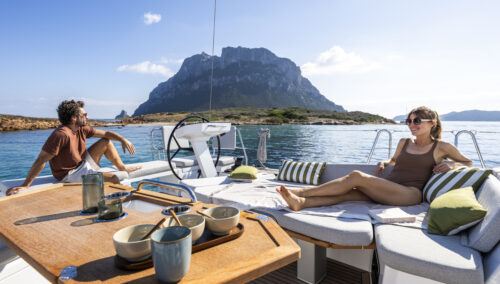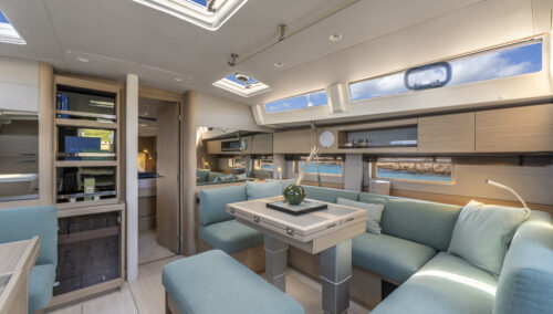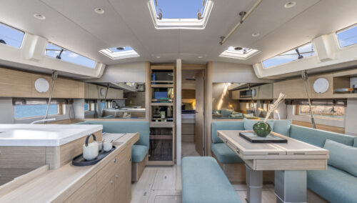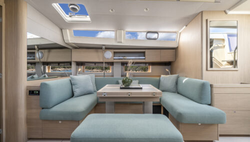 The Oceanis 52’s bold lines, pronounced chine, and full-beam design create both visual drama and real functional benefits. The cockpit is 30% larger than its predecessor, offering twin C-shaped benches and a diamond-shaped social zone. Two height-adjustable tables convert easily between dining, sunpad, or lounge arrangements. The lifting swim platform and wide side decks ensure easy water access and safe circulation.
