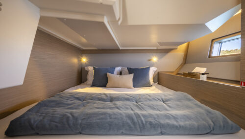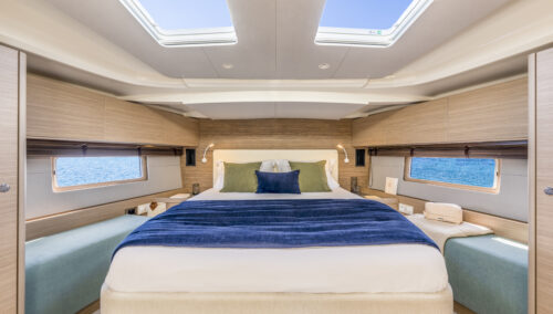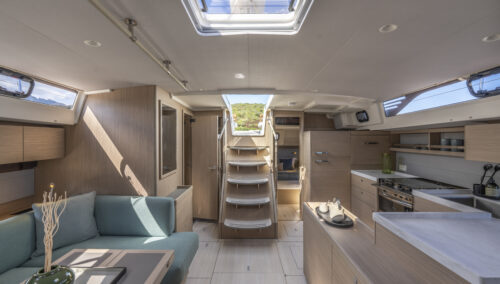 The interior is warm, bright, and highly customizable. With premium upholstery, oak woodwork, and refined finishes, the ambiance is both modern and welcoming. Large portholes and overhead hatches flood the space with light, inviting a connection with the sea.