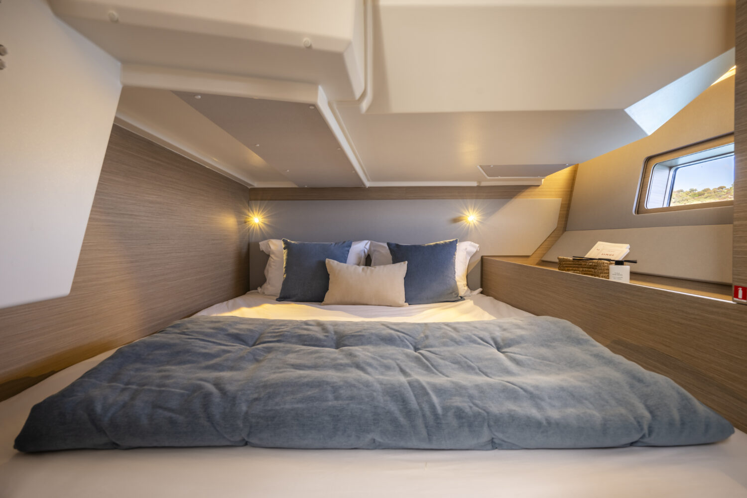 The interior is warm, bright, and highly customizable. With premium upholstery, oak woodwork, and refined finishes, the ambiance is both modern and welcoming. Large portholes and overhead hatches flood the space with light, inviting a connection with the sea.