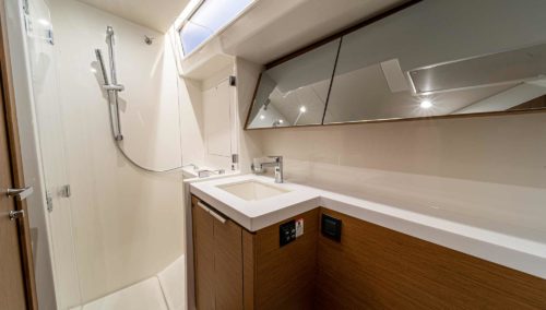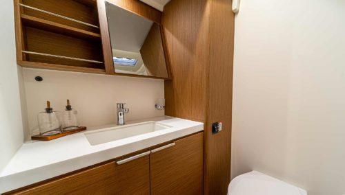 A warm and modern interior welcomes you below deck, matched with the amenities and space found at home. Finding your favorite spot to relax will be a breeze with a dedicated chart table with lounge-style seating and a large bright saloon with windows strategically placed to provide views of the sea at every angle. Choose between a three-cabin, two-head, or a three-cabin, three-head layout.