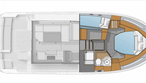 The standard inboard Yanmar 6LY 400cv engine with 212 Gal fuel tank offers a range of 350NM at 8 knots cruising (with a 10% fuel reserve). The power can be increased to 440cv.