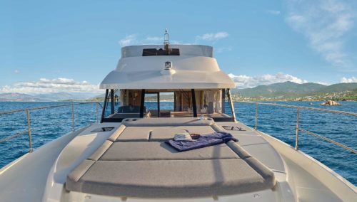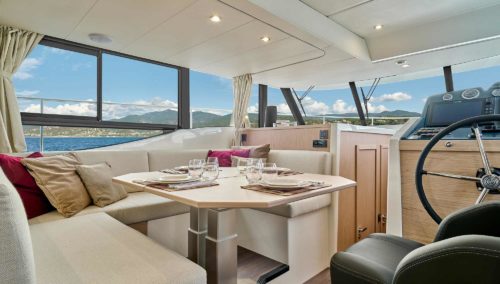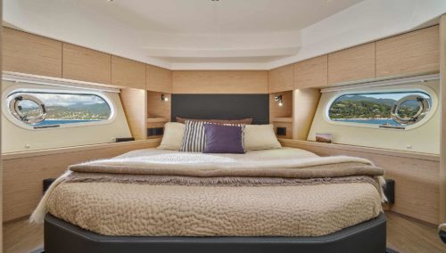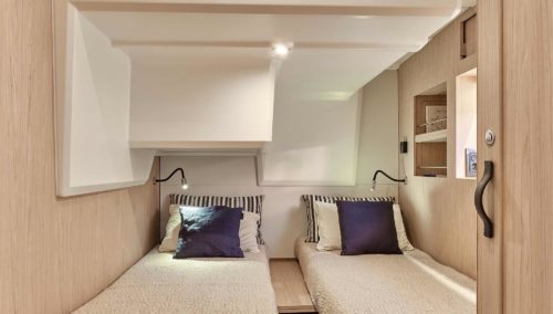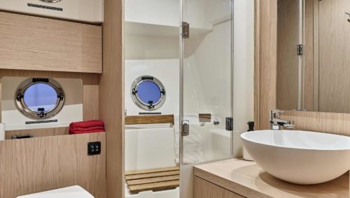 Truly feel at home on the water with three cabins in the lower accommodations and easily transform the salon dinette for additional space if needed. The forward master cabin offers a comfortable double berth with an ensuite and separate shower. The portside guest cabin offers two single berths with an infill to convert into a double berth, a connected ensuite door to the portside day head. The starboard guest cabin features a double berth with storage including space for an optional washer/dryer.