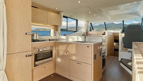 The BENETEAU Swift Trawler 48 is the largest Swift Trawler with an overall length of 48’4”. The flybridge provides a comfortable and relaxing space to gather while enjoying panoramic views. Coming down the flybridge stairs into the aft cockpit, ample space is provided for a table with folding chairs. A transom double provides access to a large swim platform with an optional hydraulic lifting system perfect for carrying water toys or tenders. Inside, a large L-shaped galley features a standard gas oven, a clever “magic corner” pull-out storage unit, and cupboards & drawers with ample storage space.