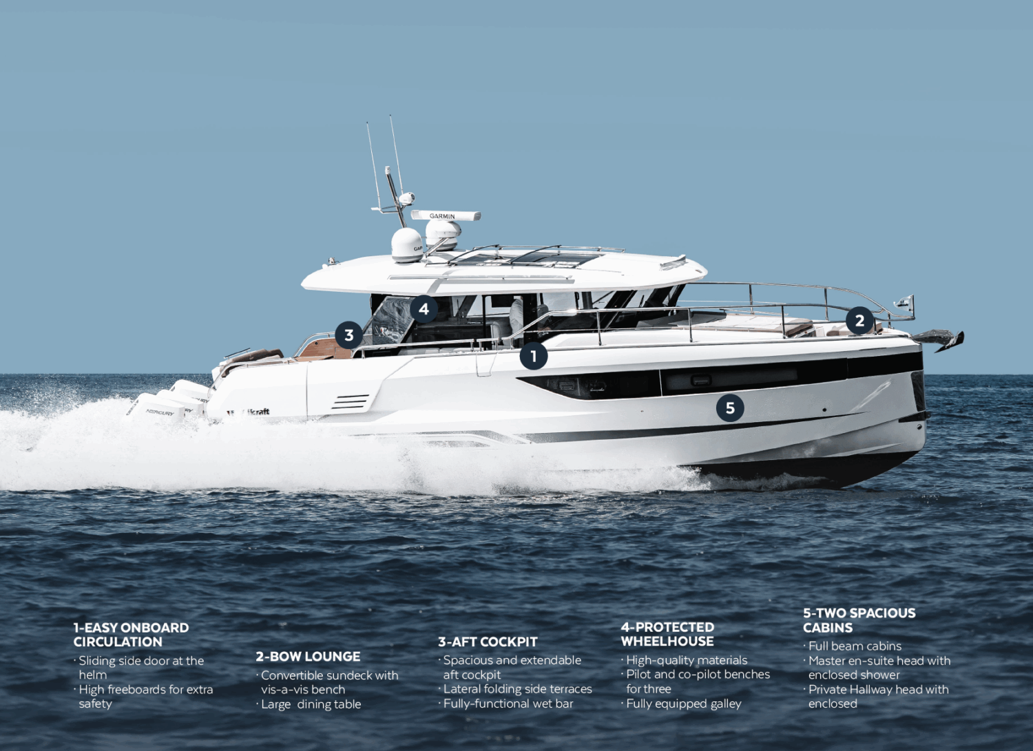 Boasting an impressive length of 44 feet, the Wellcraft 44 Explorer responds to the toughest demands with its powerful performance and seaworthy capabilities. Its innovative layout offers spacious social areas, including lateral folding terraces, a fully equipped wheelhouse, and luxurious cabins with private bathrooms. Making every adventure both comfortable and thrilling.