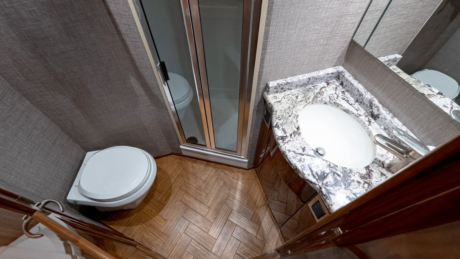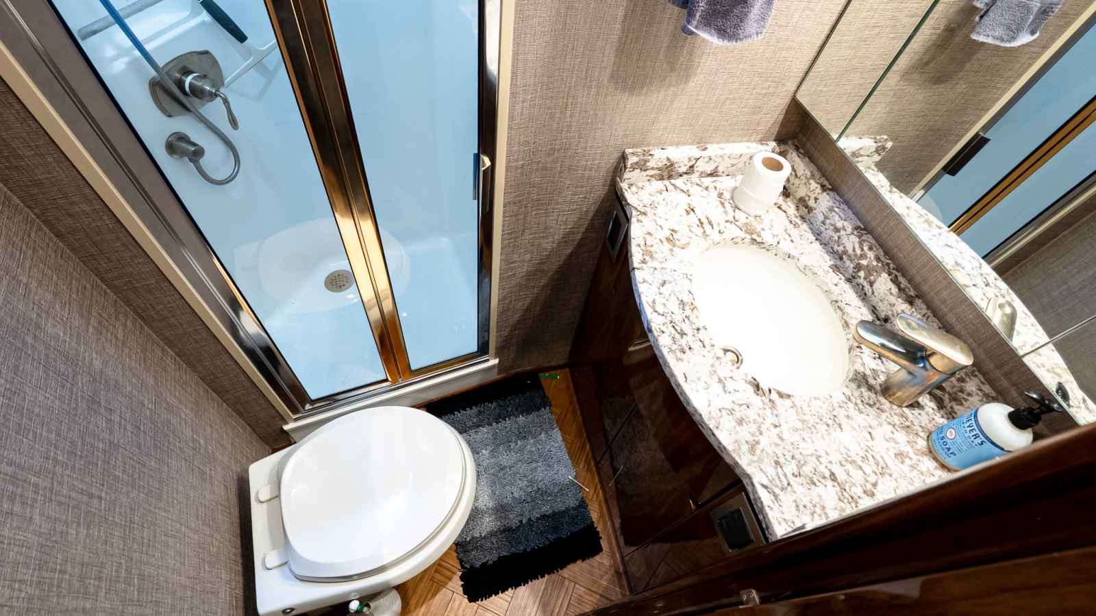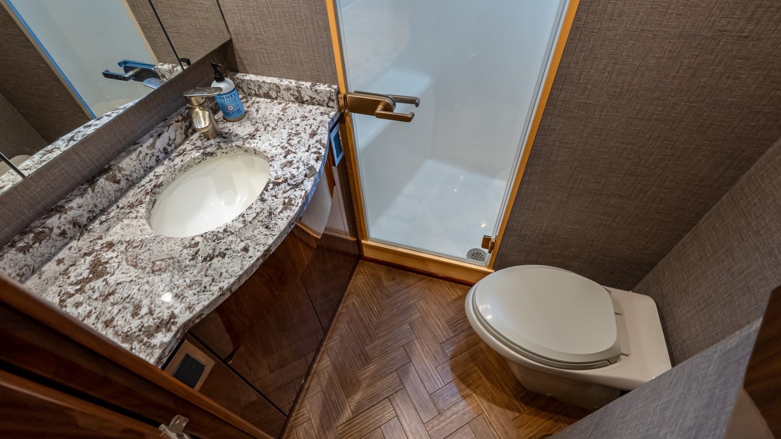 - Private Head with Granite Countertop, Mirrored Medicine Cabinet, and Stall Shower