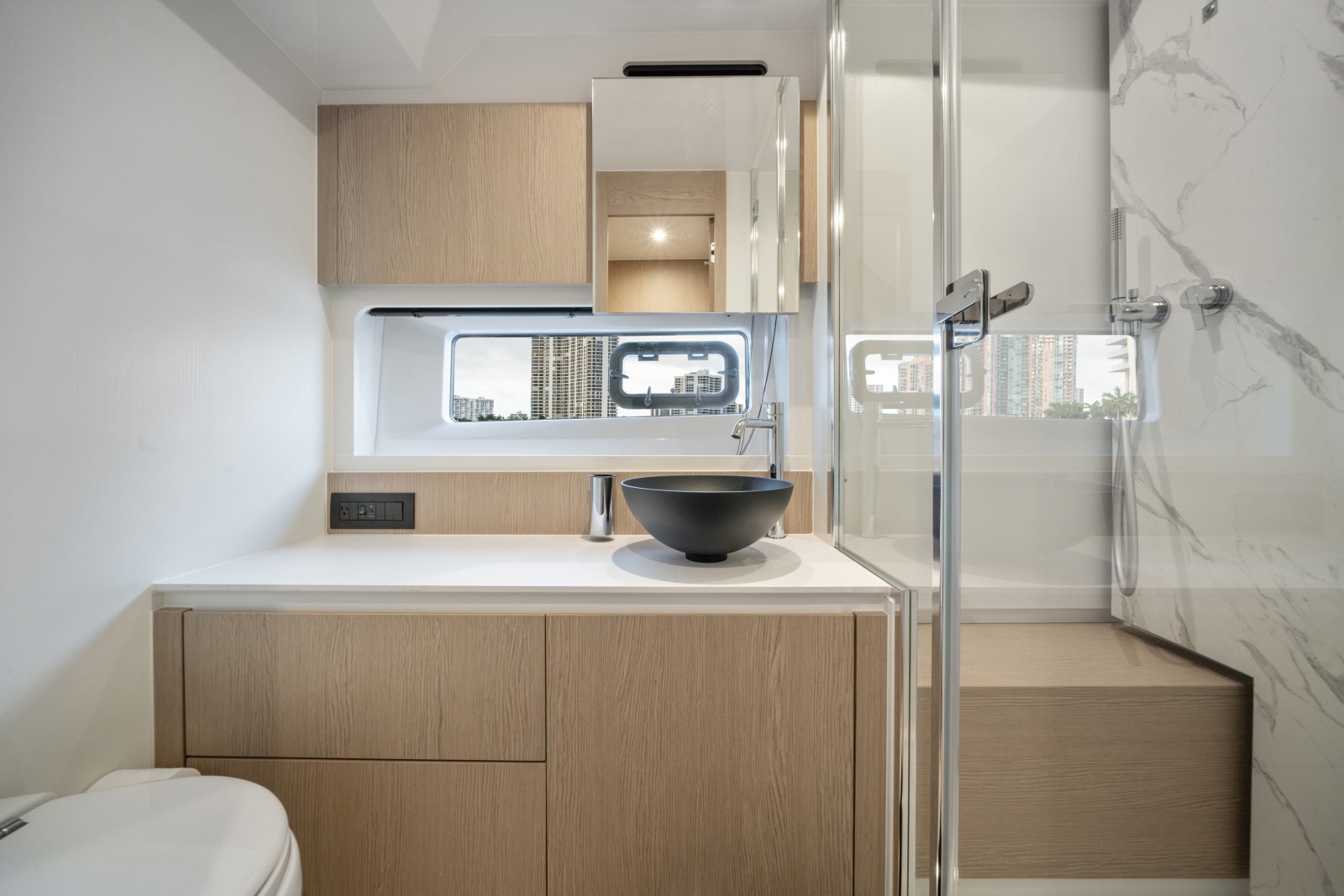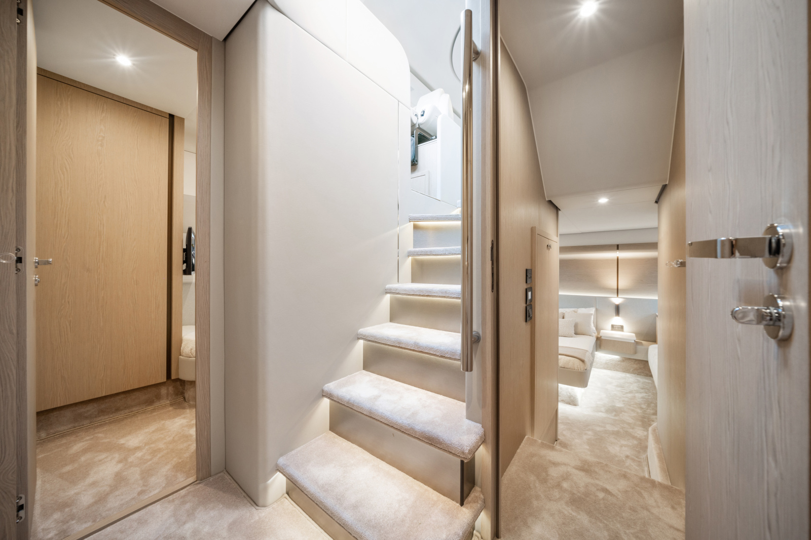 Outdoor living is a highlight, with a well-appointed flybridge, aft cockpit, and foredeck lounge—ideal for entertaining or relaxed cruising.