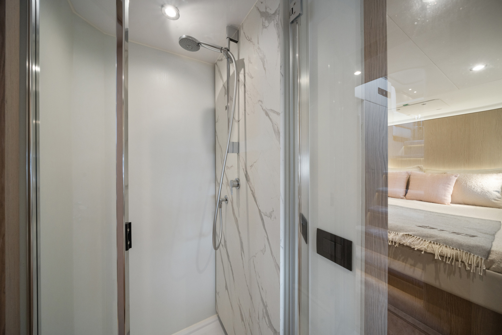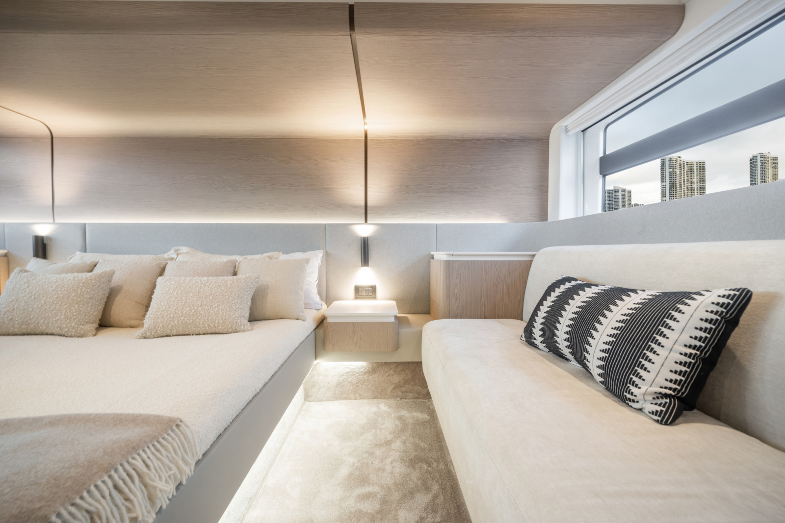 Below deck, the three-stateroom layout includes a full-beam master, forward VIP, and twin guest cabin, comfortably accommodating six guests, plus a crew cabin aft.
