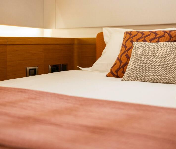 Below decks, the First 60’s interior elevates life at sea with spacious, well-lit accommodations that blend comfort and function. A cozy dining area faces the owner’s navigation corner and sofa, while the full-beam galley — with elongated worktop and abundant storage — supports efficient meal preparation even under sail. The owner’s cabin is a standout retreat with a large walk-around, forward-facing berth, generous natural light, and tranquil sea views that enrich long passages or overnight stays.