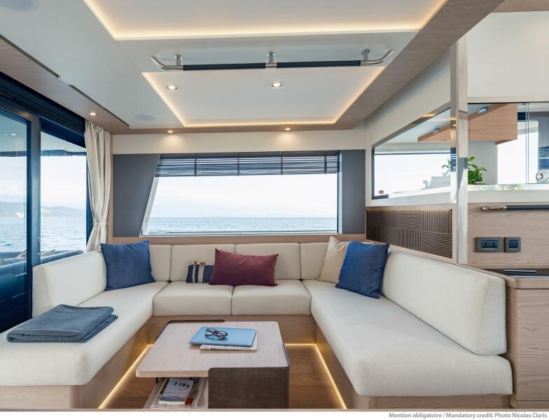 The BENETEAU Grand Trawler 63 has a distinctive displacement hull developed by MICAD, which aims to improve cruising range and efficiency, making it easier for owners to cast off on long-distance cruises. Designed for 6 to 8 people on board (+ crew), the boat has an impressive flybridge – one of the biggest on the market.