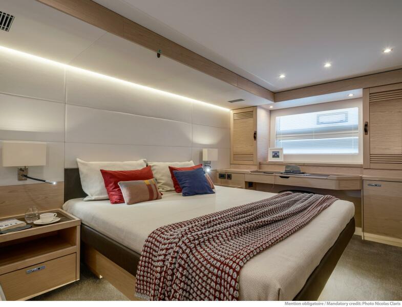 The interior is spacious and well-appointed. The galley can be completely enclosed. The VIP guest cabin in the bow has a generous amount of headroom so that you feel like you are in a hotel suite. Strikingly spacious inside, with volumes similar to much bigger yachts, and ingeniously designed, these large passagemakers also have enough space to house a crew comfortably. A satin wax-finished wood, leather, and elegant textiles make for a stylish interior and exterior, carefully designed by the experts at Nauta Design. The midship owner suite makes clever use of the maximum beam so that you feel like you are staying in a luxury suite.