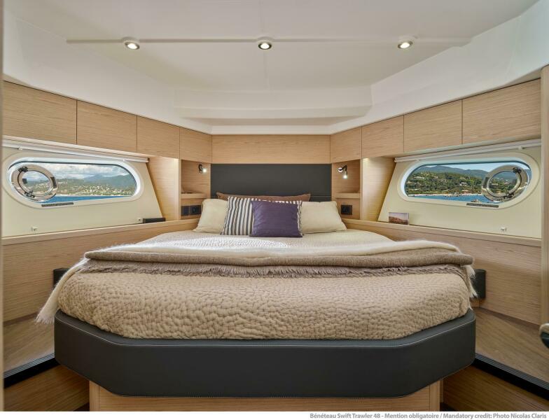 The Swift Trawler 48 is provisioned to sleep 6 passengers, with three cabins in the lower accommodation and additional capacity with an easy-to-convert salon dinette with wrap-around privacy curtains as standard equipment. Start your journey on the BENETEAU Swift Trawler 48!