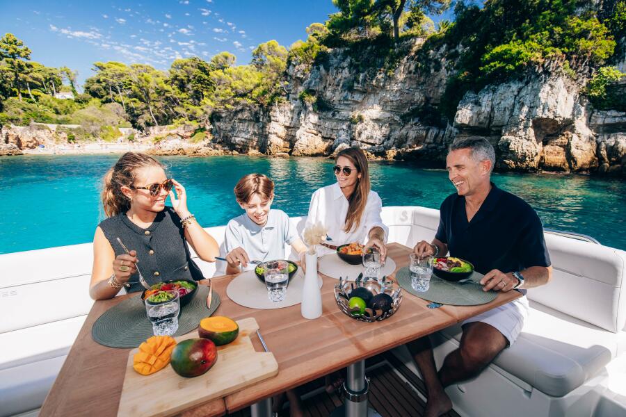 The owner's cabin is spacious and bright, and has its own ensuite bathroom, as does the VIP guest cabin. A third cabin can be used as a single or double berth, or easily become the extra storage space any owner needs. With the wheelhouse's convertible salon, the boat can accommodate up to eight people for a pleasant night on board. Whether you're embarking on a weekend getaway or a longer voyage, the Antares 12 coupe is equipped to meet your needs. Experience the perfect blend of luxury and functionality with this remarkable cruiser, ready to make waves in your boating adventures.